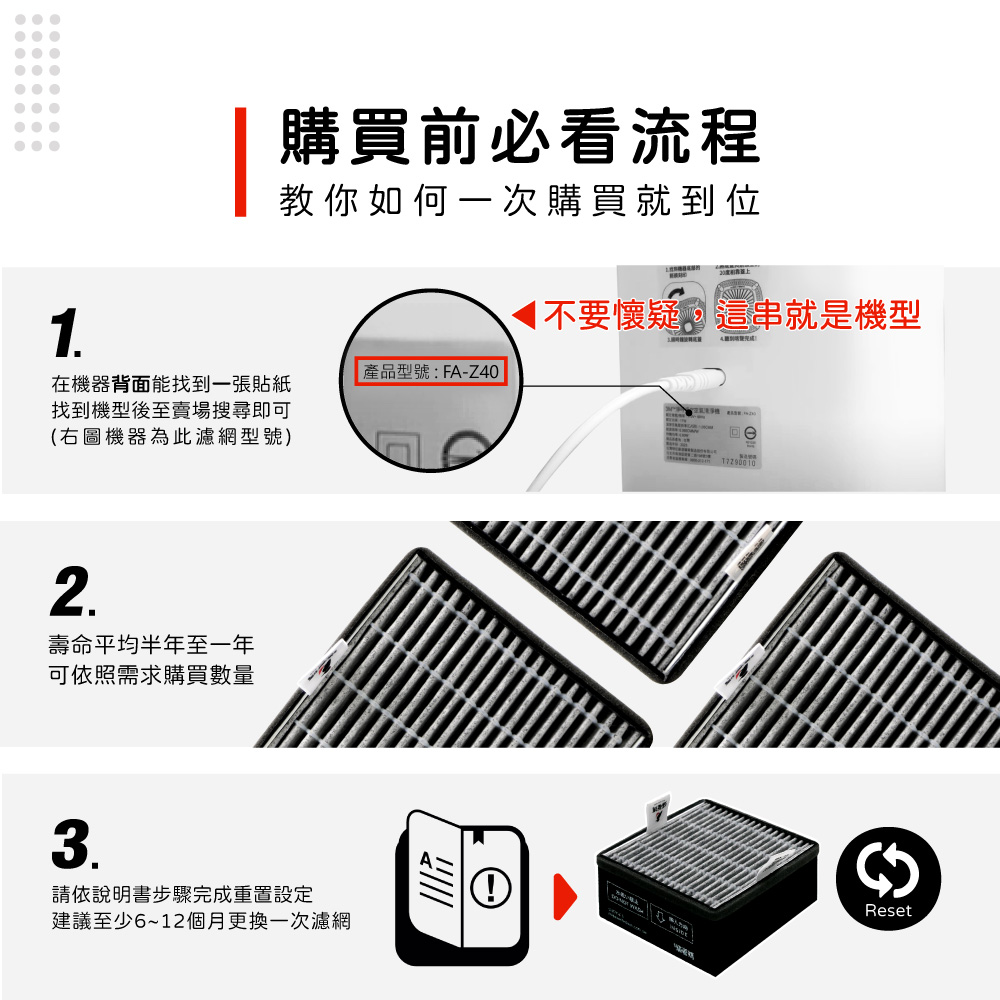 全館任選 2 件,可享 95折適用型號:3M FA-Z40 極淨化空氣清淨機對應濾網型號:Z40-F(靜電高效濾網)使用效期:建議至少每6~12個月更換一次濾網注意事項:濾網請勿水洗請依說明書步驟完成重置設定